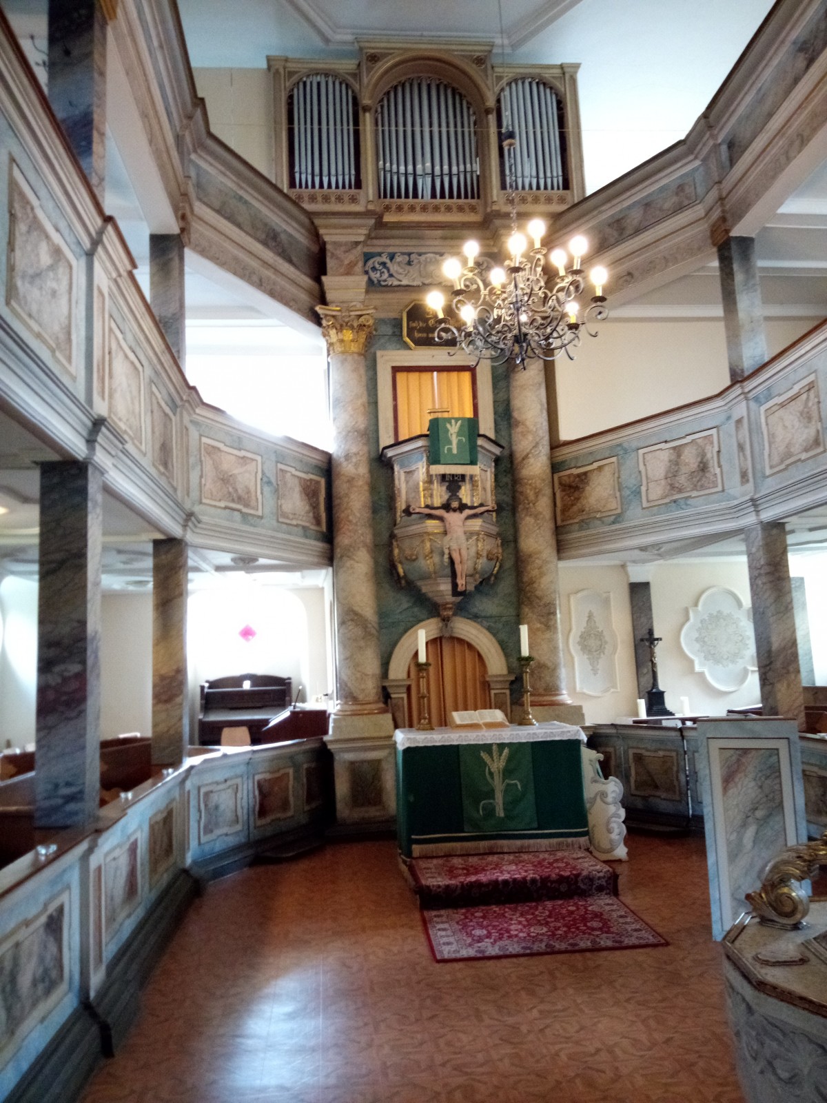 In der Bülstringer Barock-Kirche von 1708 fällt sofort die Sitzordnung auf: Man sitzt nicht hintereinander, sondern schaut sich an, wie in einem Schiff, eben einem Kirchenschiff. An Stelle der beiden Masten stehen Taufstein und Altar.