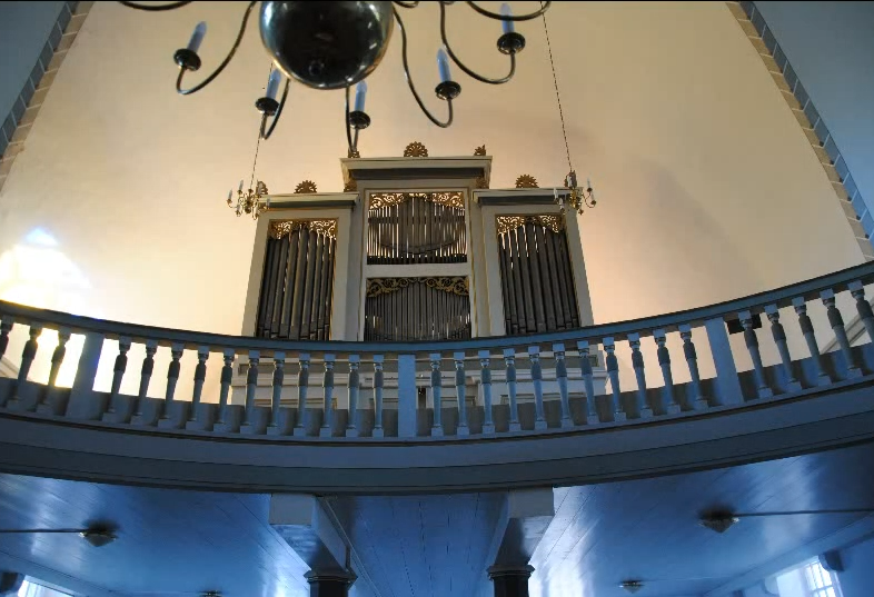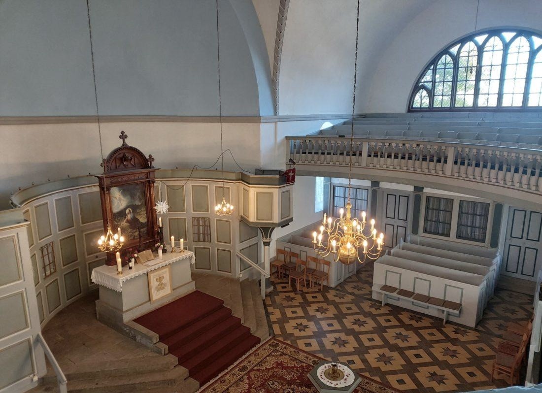 Im Inneren ist der von einem weiten Keuzgewölbe überspannte Raum von einer dreiviertelkreusrunden Empore umfasst. Der Altar mit dem Gemälde Christi ist leicht erhöht, rechts davon befindet sich die Kanzel. Die komplette klassizistische Innenausstattung ist bemerkenswert!