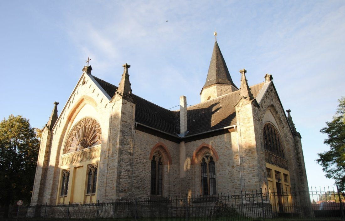 Von den angeblich im Mittelalter existierenden drei Kirchen im Ort hat das Zeitalter von Krieg und Säkularisation nur eine überlebt, die anderen wurden schon in früheren Zeiten teilw. als Stall genutzt. Das Patrozinium der Hl. Lucia und der Hl. Ottilie ist in Mitteldeutschland ungewöhnlich, beide Heiligen haben ihren Namenstag am 13. Dezember, eventuell war dieser Tag also bedeutsam für die Kirche. Spätestens seit 1582 ist das Patrozinium nachweisbar. Im Zuge des Anwachsens des Ortes wurde eine neue Kirche errichtet. Das heutige Bauwerk im neogotischen Stil mit Tudor-Elementen wurde als kreuzförmiger Zentralbau mit Westturm auf einer Anhöhe ab 1820 bis 1833 nach Plänen des hallischen Baumeisters Johann Justus Peter Schulze erbaut.