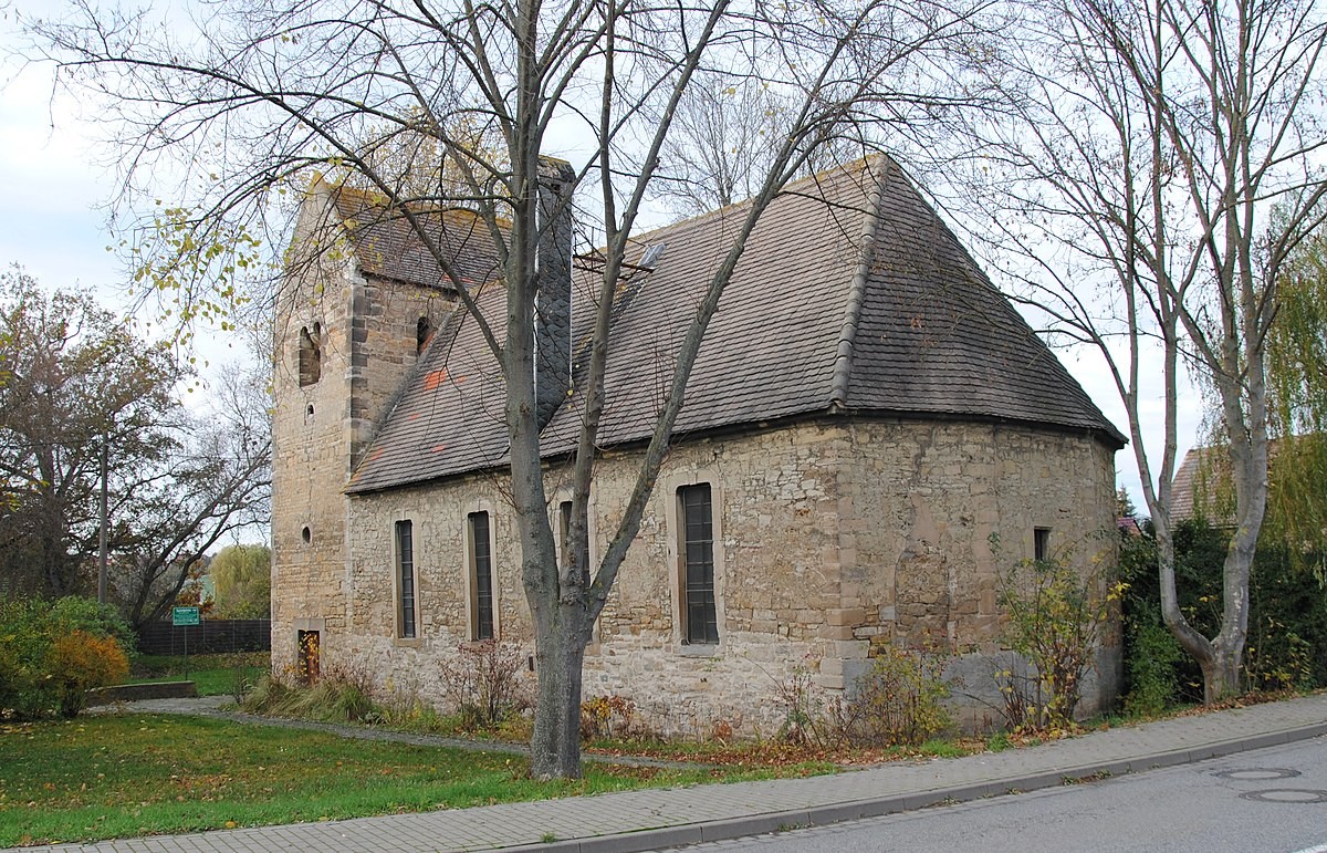 Ältestes Bauwerk im Ort ist die dem Erzengel Michael geweihte Kirche, heute direkt an der Hauptstraße gelegen und von dieser aus gut sichtbar. Das Gotteshaus ist in der typischen Architektur des Saalkreises als einschiffige Saalkirche mit massivem Westquerturm samt Satteldach erbaut. Im Turm künden romanische Kapitelle in den Schallöffnungen sowie romanische Zierfenster von der zeitlichen Herkunft der Kirche. Später erfuhr das Gotteshaus Umbauten, unter anderem wurde ein dreiseitiger Chorabschluss angefügt und im Zuge eines barocken Umbaus auch Halbbogenfenster eingebaut. Der helle Innenraum wird von einer Holztonnendecke überwölbt und von einer L-förmigen Empore umgeben. Der barocke Kanzelaltar mit floralem Schnitzwerk an den Seiten ist um 1725 entstanden, ebenso wie der mit schlichten seitlichen Schnitzwangen verzierte Orgelprospekt.
