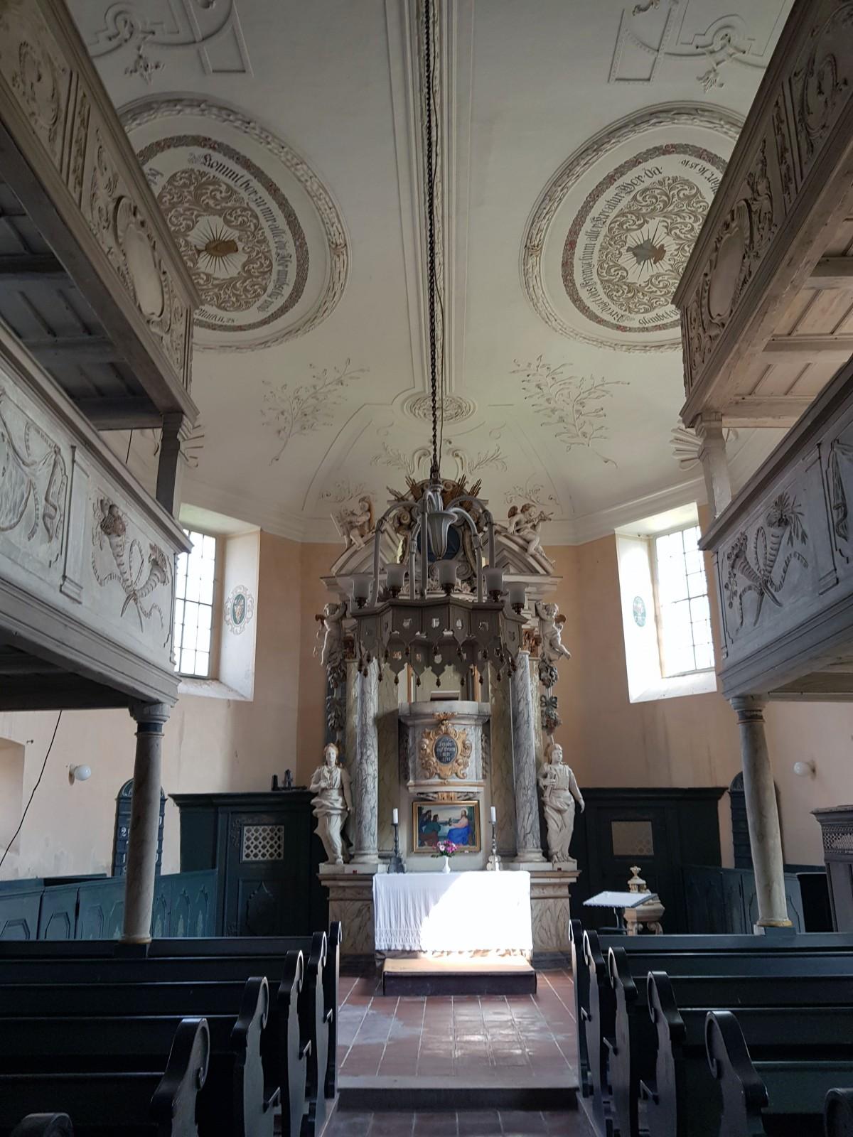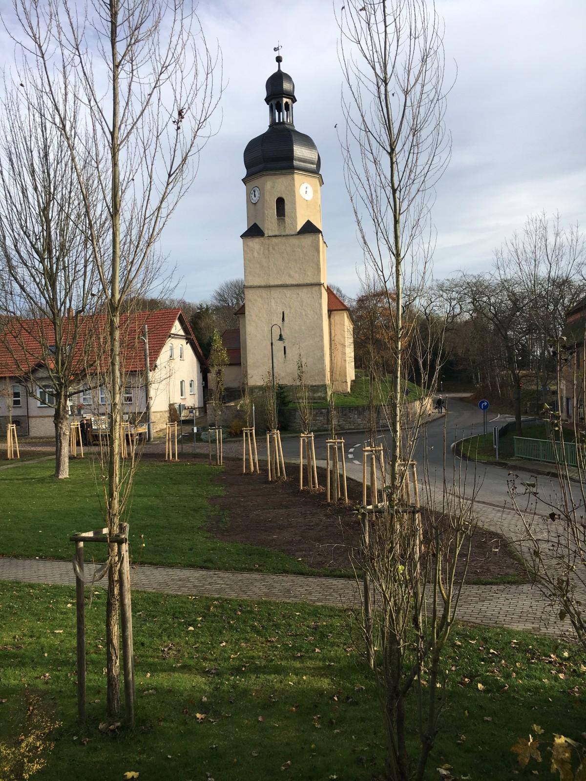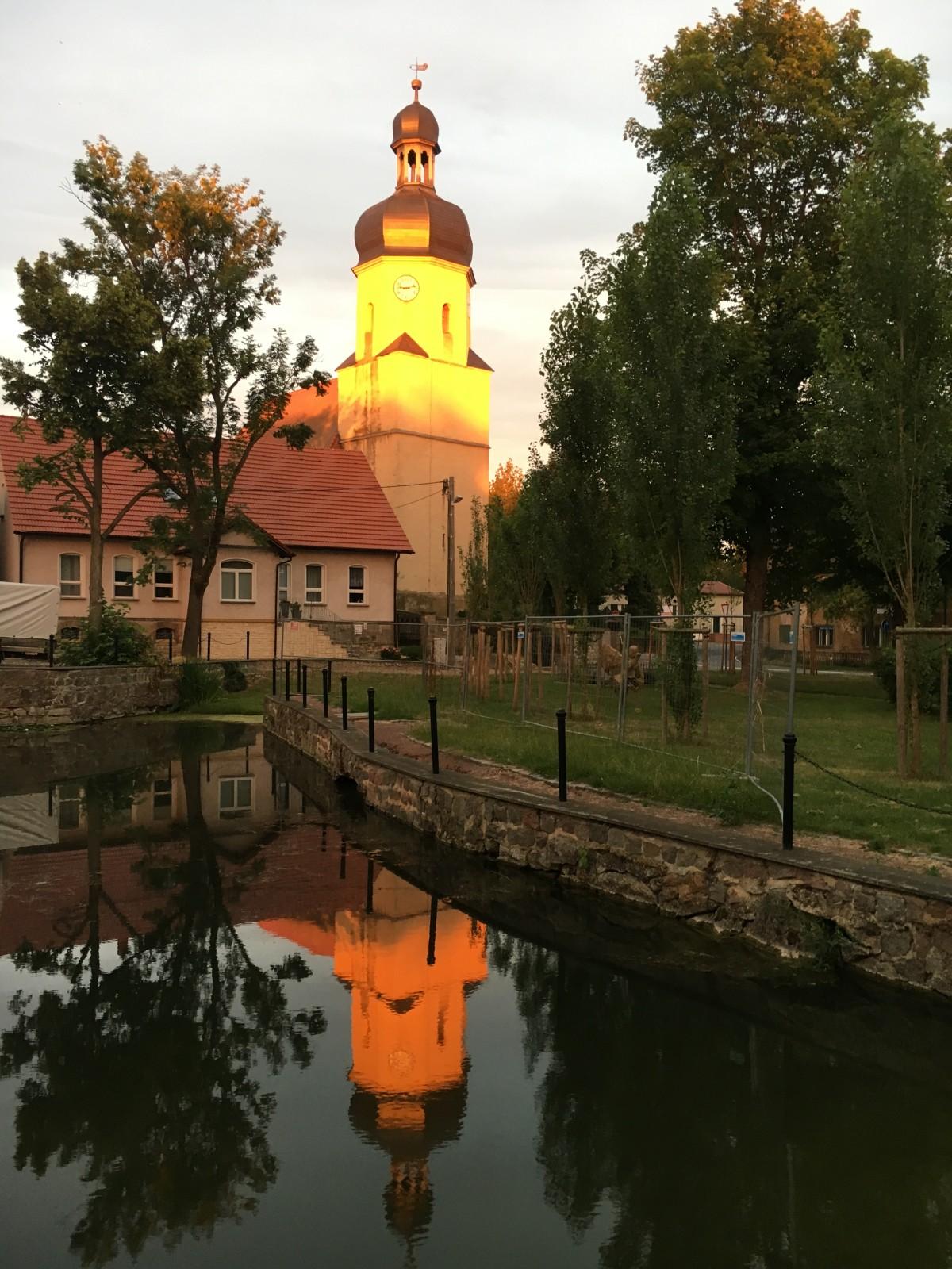 Zentrales Bauwerk ist heute noch die Kirche St.Stephanus, auf einer kleinen Anhöhe über zwei Durchgangsstraßen gelegen. Sicher befand sich hier seit den Zeiten der Slawenmission ein Gotteshaus, später folgte ein Bruchsteinbau, welcher über die Jahre hinweg immer wieder erweitert wurde, das Bauwerk, ein einschiffiger Kirchsaal mit dreiseitigem Chorabschluss, erhielt um 1500 einen eingezogenen Turm, dessen unterstes Geschoss noch heute erhalten ist. 1662/63 wurde die Kirche nach dem dreißigjährigen Krieg fast vollständig erneuert, 1702 wurde der Turm erhöht und das oktogonale Glockengeschoss samt welcher Haube aufgesetzt. 1730 erfolgte unter ausdrücklicher Schirmherrschaft von Heinrich Franz II. von Mansfeld eine erneute, sehr beeindruckende Erweiterung im Barockstil - eine Tafel überm Eingang erinnert an dieses Ereignis. 1914, auch dies ist am Eingang zu lesen, wurde die Kirche "Im Jahre des Weltkrieges [...] durch Gottes Gnade in Frieden erneuert". Später verfiel das Bauwerk zusehens, erst Anfang der 90er begann eine liebevolle und gründliche Sanierung. Bemerkenswert im Inneren sind die hochwertigen und fein ausgeführten Stuckarbeiten an der flach gewölbten Decke und an den Emporen - diverse Zierkartuschen mit Bibelsprüchen sind dort zu sehen, unter der Orgel prangt prominent das Wappen der Grafen zu Mansfeld, darunter hängt der ehemalige, aus Holz geschnitzte Taufengel. Der Kanzelaltar, bekrönt von Putten sowie dem göttlichen Auge und flankiert von vier ionischen Säulen mit marmorierender Malerei sowie zwei lebensgroßen Figuren, entstand ebenfalls 1730. Die Innenausstattung zeugt auf beeindruckende Weise vom Wohlstand des Ortes und ist für eine mitteldeutsche Dorfkirche in dieser Qualität herrausragend!