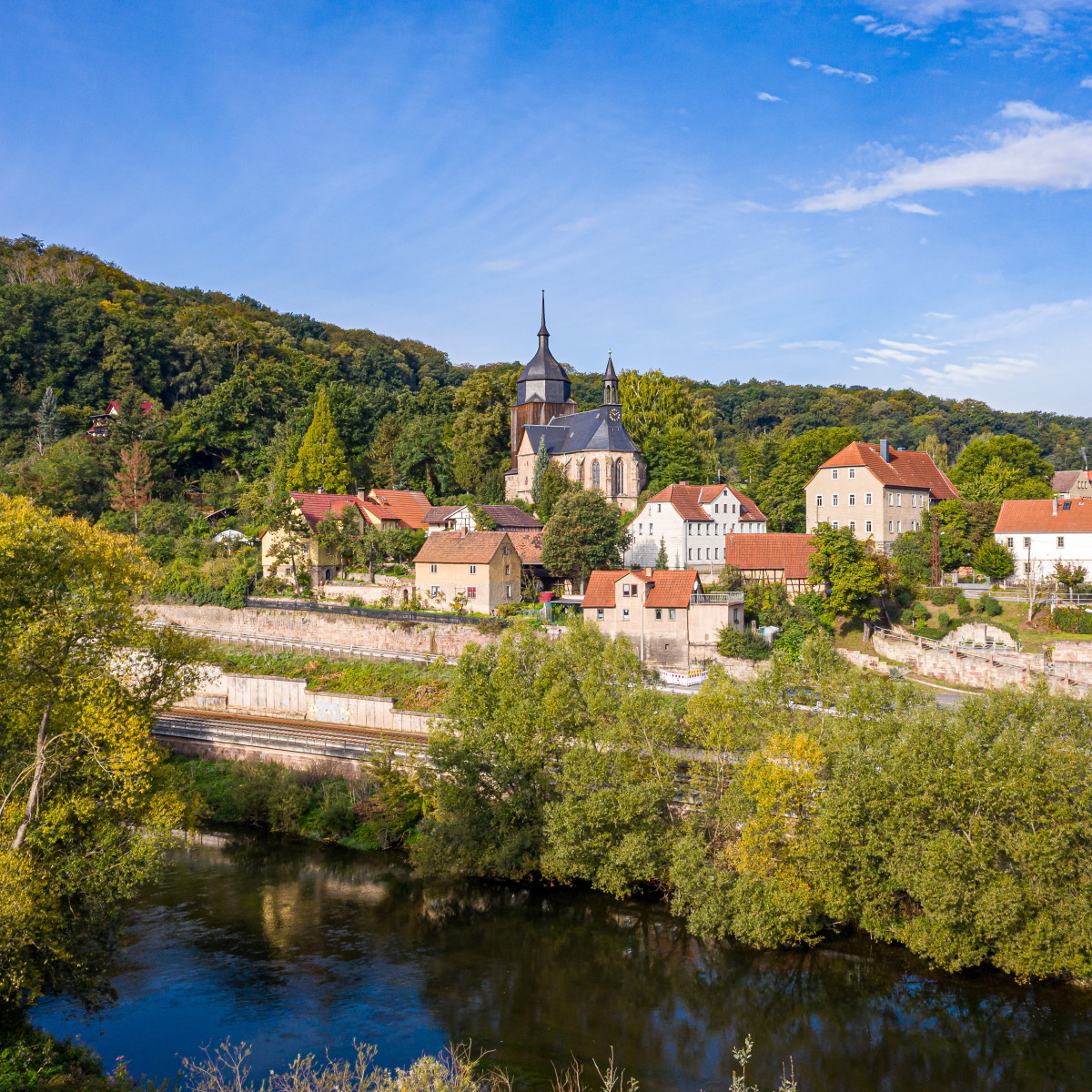 Im Altarraum befinden sich die heilige Familie (1932), das heilige Abendmahl (um 1810), der Marmoraltar (1863), das Kruzifix und das Altarglasfenster von Glasmaler Franke aus dem Jahre 1914. Es überstand als einziges Fenster der Kirche die Brückensprengung 1945. Die übrigen Chorfenster wurden in den 50er Jahren von dem bekannten Jenaer Glaskünstler Fritz Körner mit den Symbolen der Evangelisten bzw. Kornähren und Weintrauben gestaltet. Der Taufstein aus dem 12./13. Jh. erhielt 1570 eine Überarbeitung. Die Holzfigur Christus in der Rast (1450) steht am Karfreitag am Altar. Auf den Emporen befinden sich Gemälde, die den Gekreuzigten mit Maria, Johannes und Magdalena sowie die Enthauptung Johannes des Täufers darstellen.