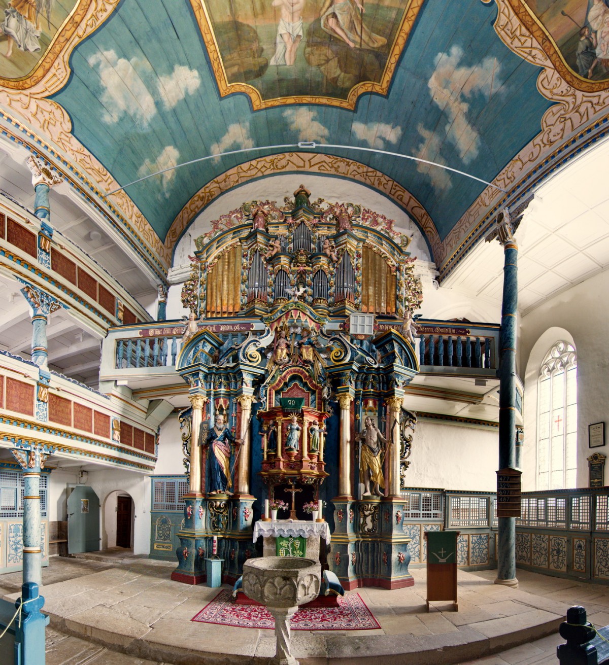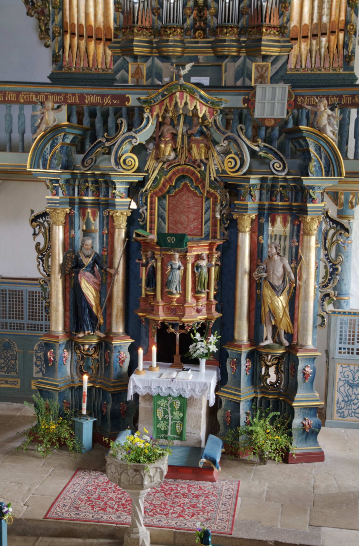 Der Kanzelaltar von 1775 bildet mit der darüber befindlichen Orgel ein Ensemble. Die Figuren an der Kanzel stellen die vier Evangelisten mit Christus in der Mitte dar, darüber thronen Gott Vater, Sohn und Heiliger Geist , als Taube. Den Altar flankieren die lebensgroßen Figuren des Mose und Johannes des Täufers.