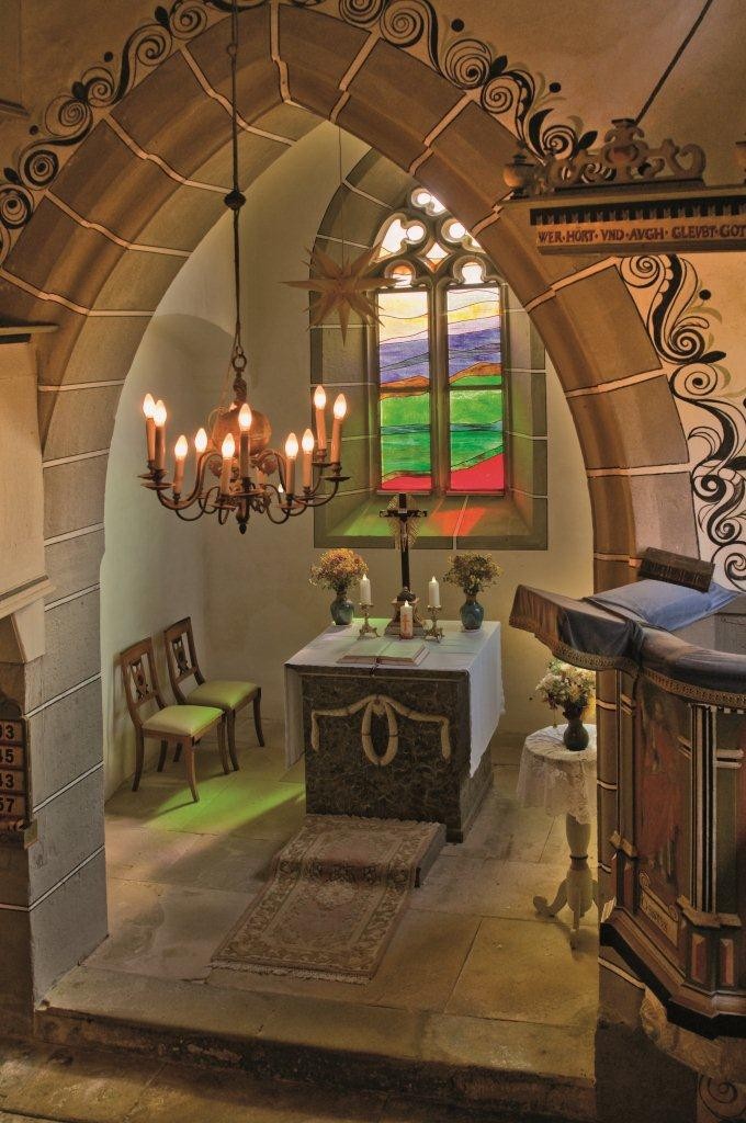 Im Kirchenraum fällt der Blick zuerst auf das farbenfrohe Altarfenster aus dem Jahr 1999, das den Charakter der die Kirche umgebenden Landschaft aufnimmt.