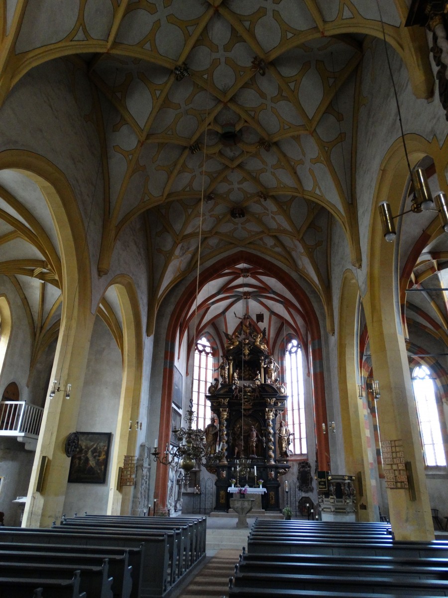Das Innere der Kirche ist in spätgotischem Stil erhalten und als dreischiffige Stufenhalle ausgeführt. Netz-, Stern- und Kreuzgewölbe zieren die Decke des Gotteshauses. Das Mittelschiff endet im Ostchor, in dem sich die steinernen Grabplatten der Grafen von Henneberg - Römhild, sowie ein barocker Hochaltar von 1692 befinden.