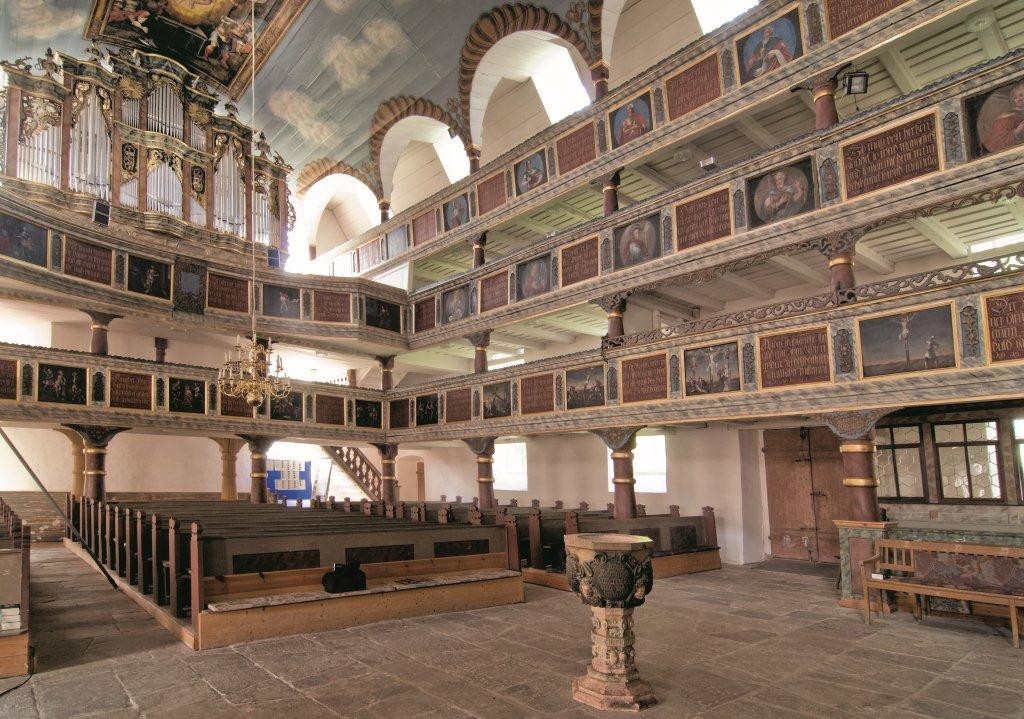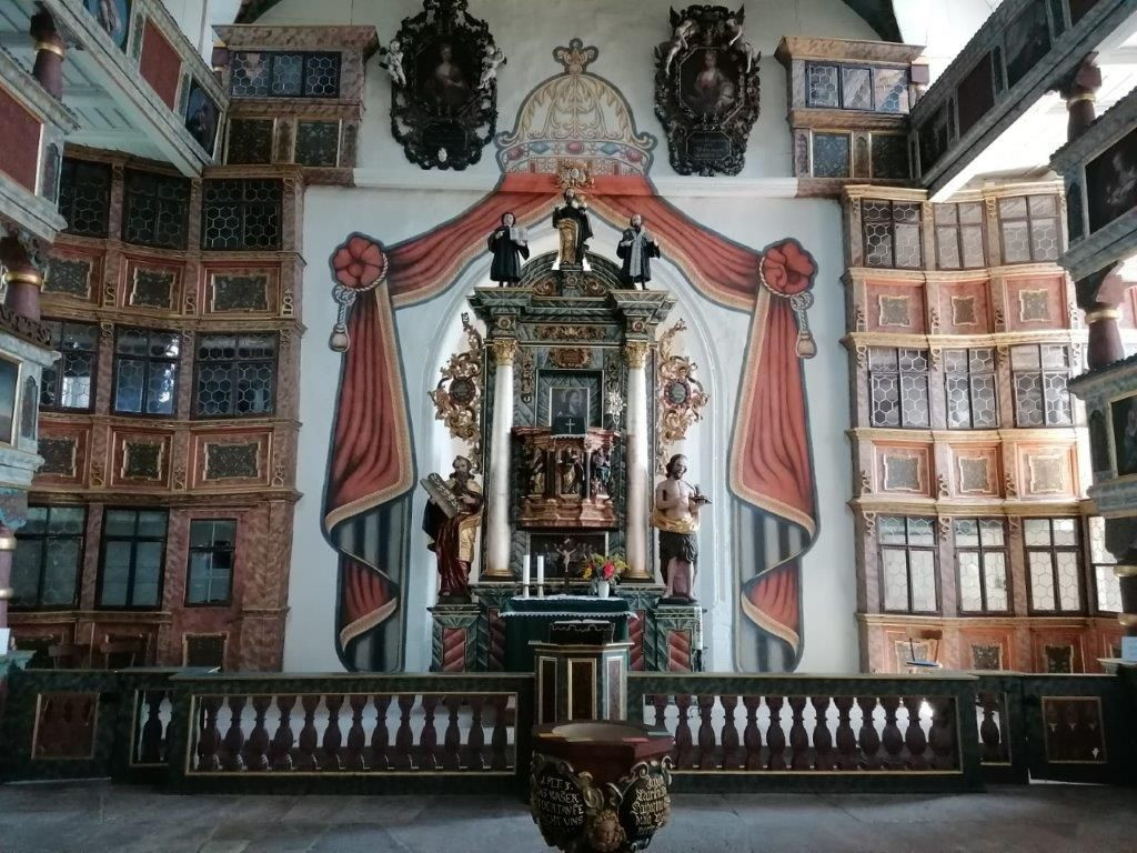 Den Kanzelaltar flankieren die Figuren Moses und Johannes des Täufers. Die Kanzel zieren die Figuren der vier Evangelisten. Der Zeitmessung der Predigt diente die seitlich angebrachte Sanduhr. Eine Besonderheit sind die Figuren von Luther und Melanchthon neben der Christusfigur auf dem Altar. Die dreigeschossigen Adels- und Freienstände beiderseits des Altars mit ihren Bleiglasfenstern und separaten Zugängen waren die Plätze für die ortsansässigen Adligen.