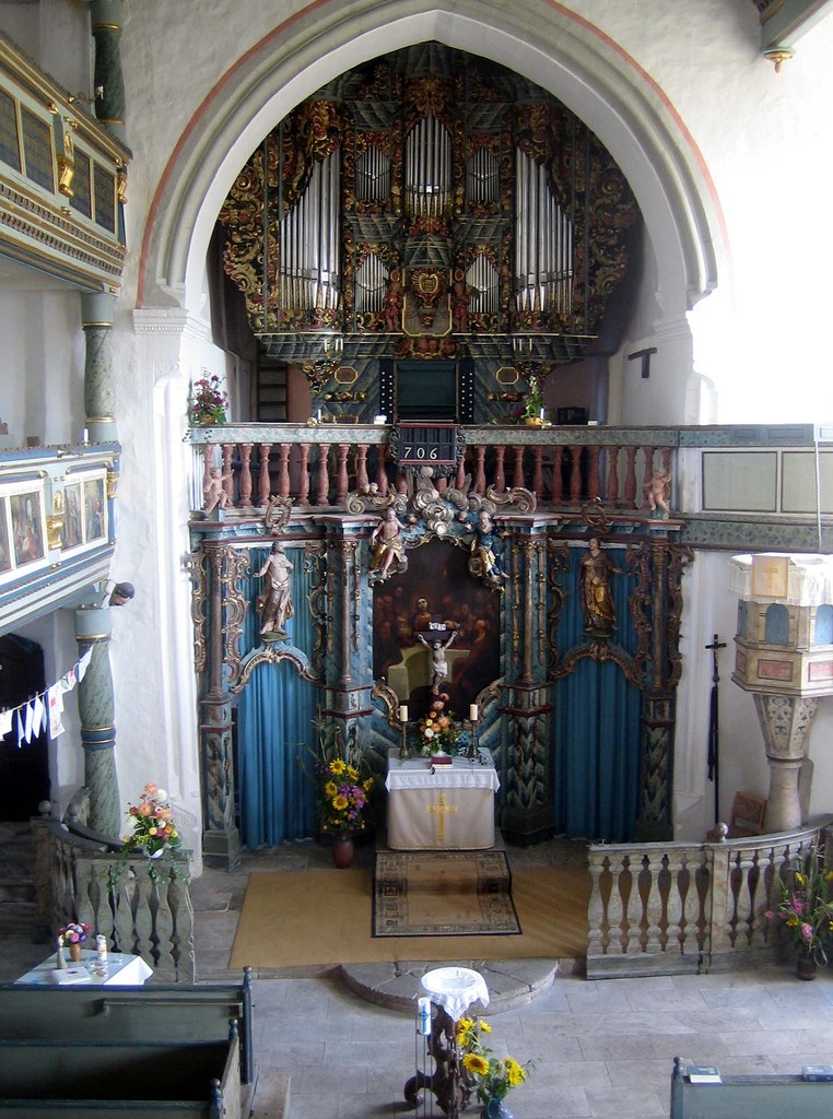 - Besonderheiten: Barockaltar, zweigeschossige Empore geschnitzt und bemalt, barocke Deckenmalereien