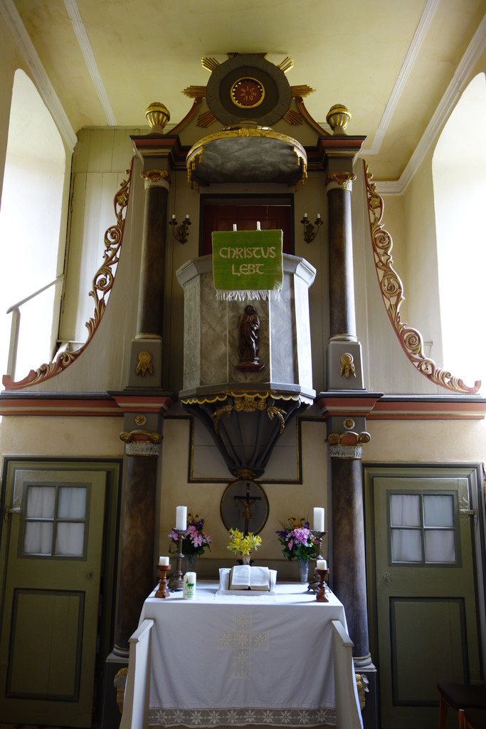 Die darüber befindliche Kanzel ist mit barocker Schnitzerei versehen. Er wurde im Jahre 2005 restauriert.