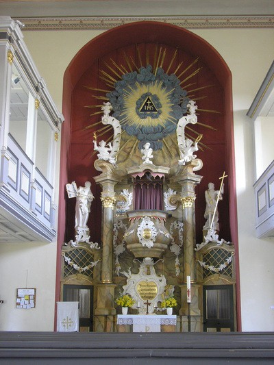 - Besonderheiten: ursprünglich eine Benediktiner-Klosterkirche, baulich verändert, jetzt geschlossene barocke Ausstattung, Kanzelaltar, Johann-Michael-Hartungen-Orgel 1756