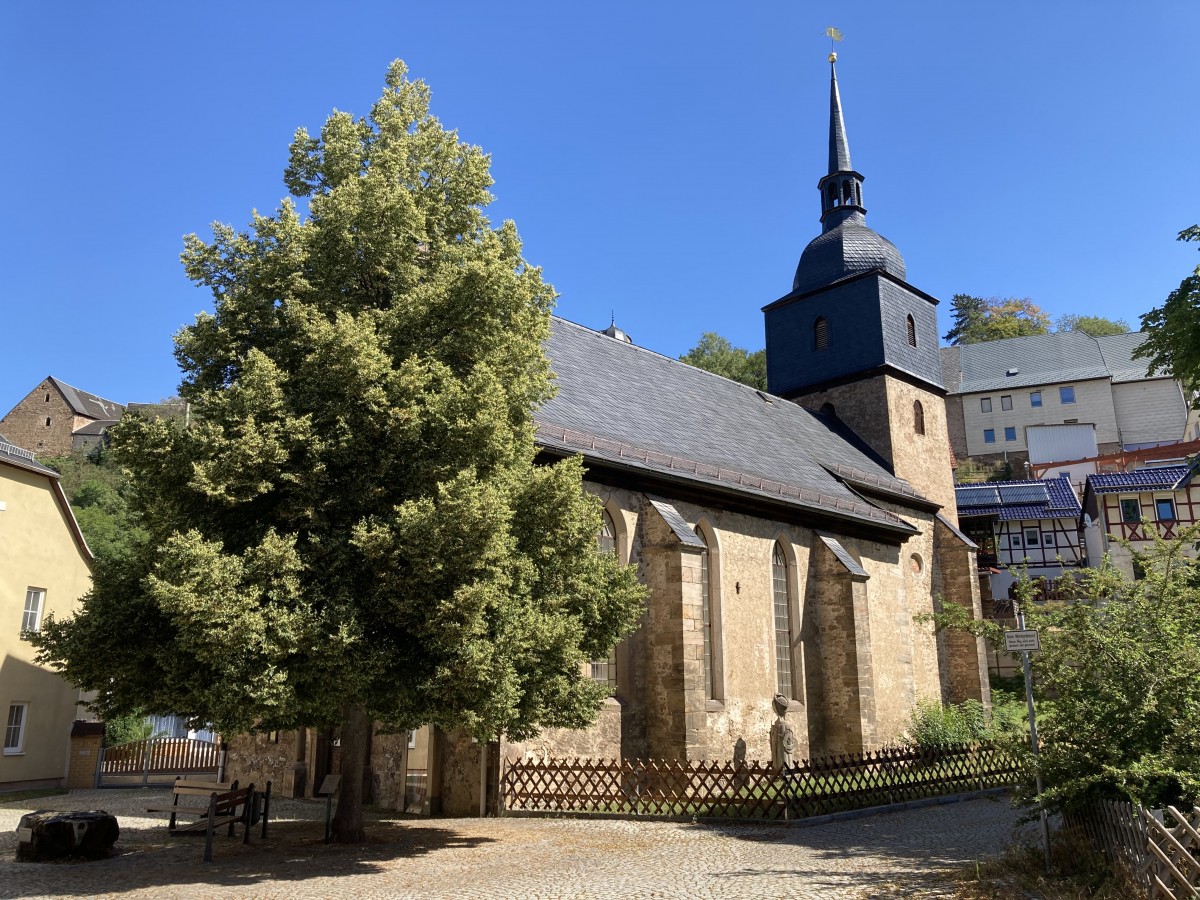 Bereits 1200 gab es ein kleines winkliges Kapellchen mit romanischen und frühgotischen Gewölbeanfängen. 1690 wurde mit dem Bau einer neuen Kirche, unter Verwendung der bestehenden Bauteile der Kapelle, begonnen und am 21. Oktober 1695 eingeweiht. Die Kirche hat eine Orgel des Orgelbaumeisters Lösche aus Rudolstadt aus dem Jahr1869.