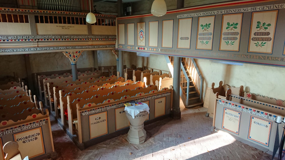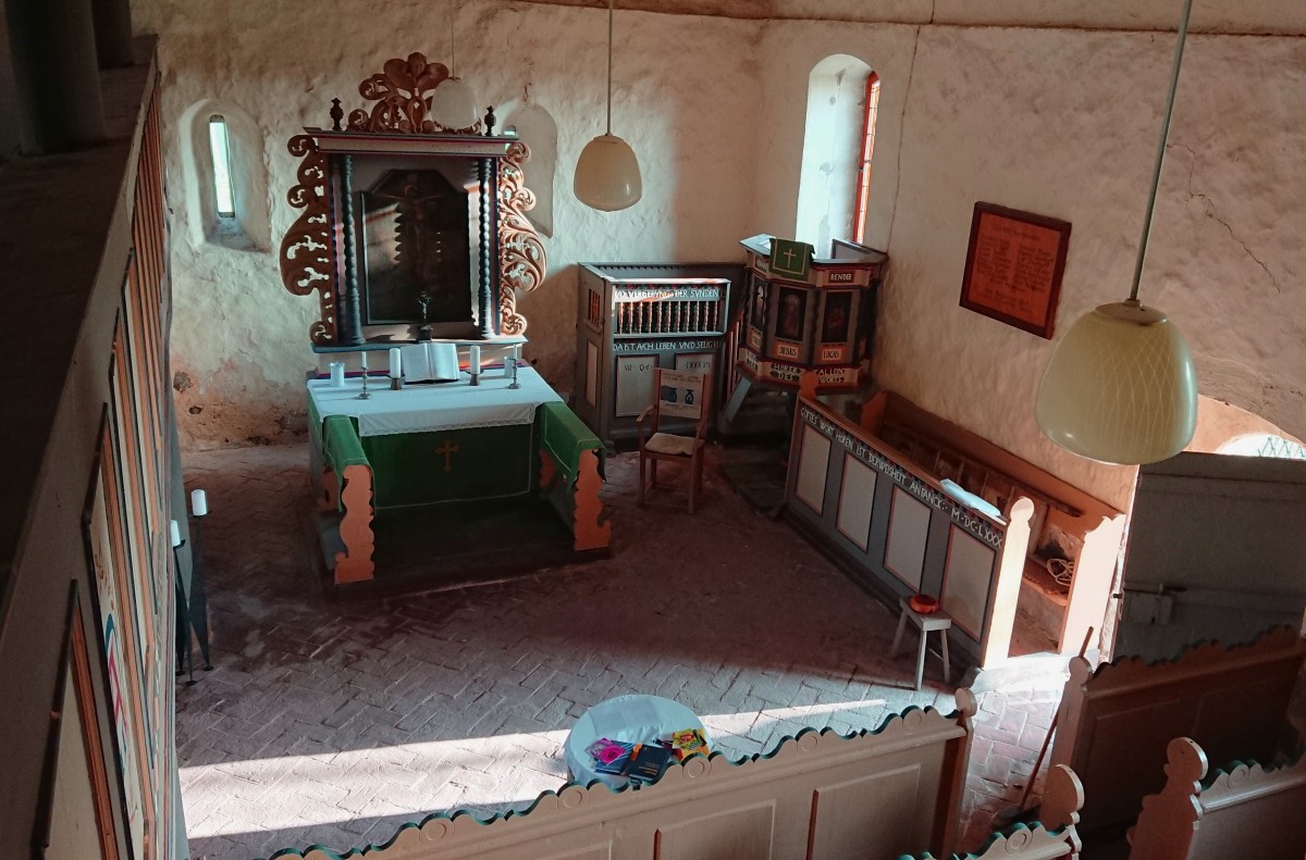 Die Ausstattung der Kirche (Emporen, Gestühl, Kanzel, Altar und Taufe) stammt komplett aus der Mitte des 17. Jahrhunderts. Für die Emporen ist ein konkretes Weihedatum vermerkt: 22. September 1668.