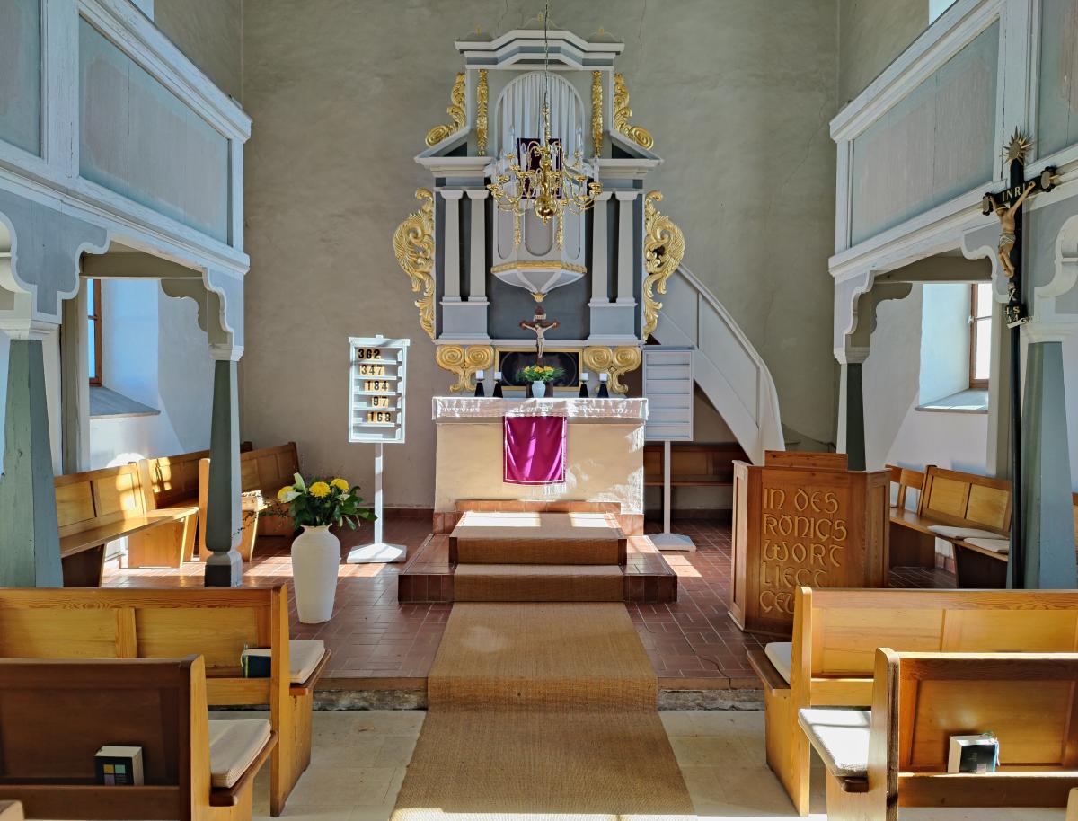 Der Kanzelaltar stammt vermutlich aus der zweiten Hälfte des 18. Jahrhunderts. Er ist sparsam verziert und zeigt keine Bilder außer einer Abendmahlsdarstellung. Auch sonst besitzt die Kirche keinen Schmuck, wie Bilder oder gemalte Bibelsprüche. Noch 1843 sollen Decke und
