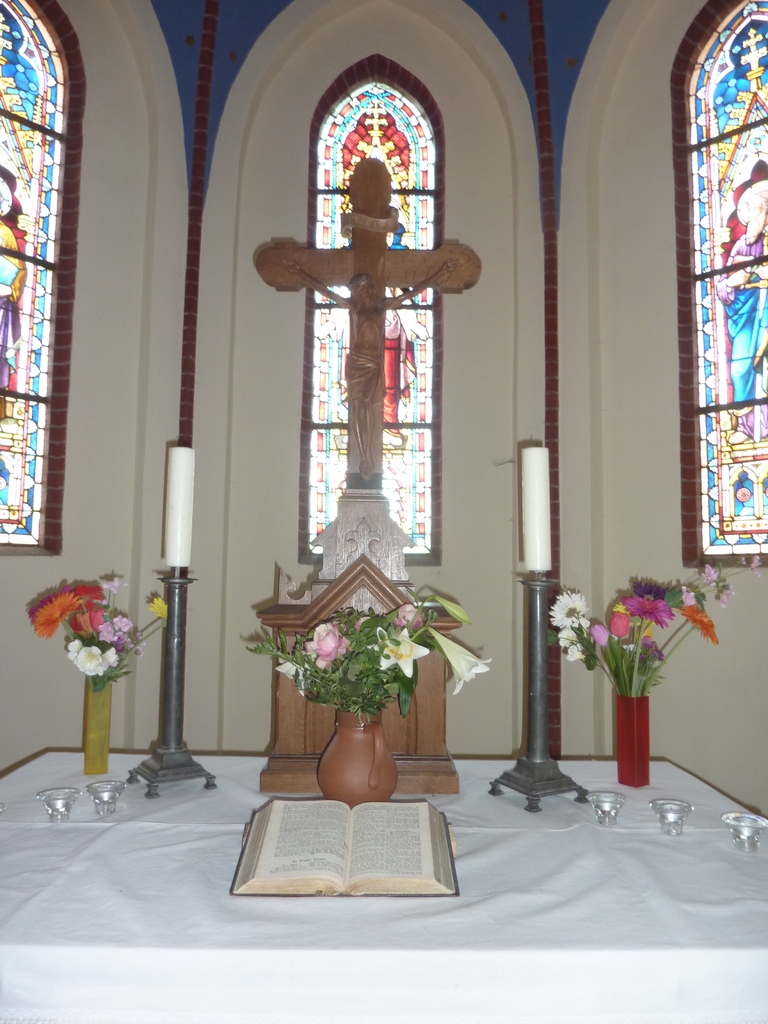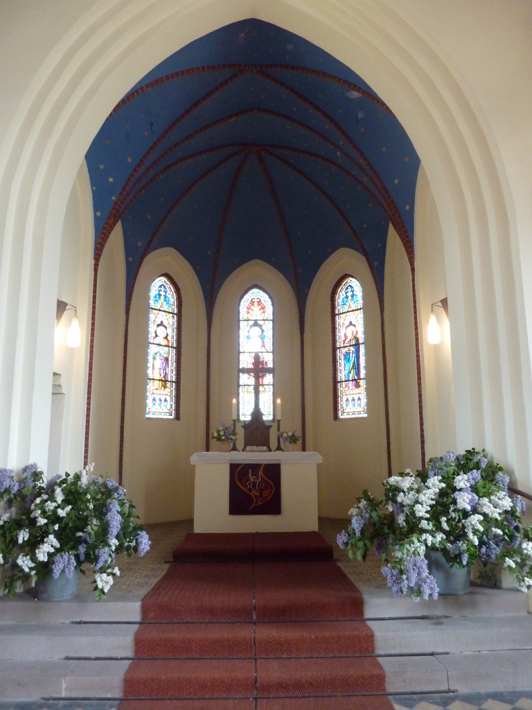 Die Apsis ist mit buntverglasten Fenstern geschmückt, welche (v.l.n.r.) Paulus, Christus und Petrus zeigen.