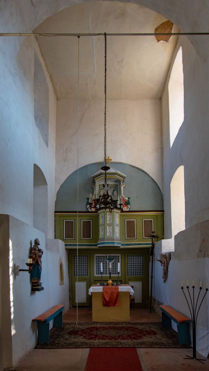 Durch die westliche Eingangstür gelangt man in die Kirche, wo man von einem farbenfrohen Raum empfangen wird. (1980/81 Ausmalung in Anlehnung an historische Befunde).