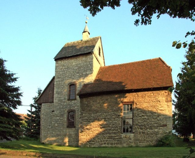 Die Kirche steht auf dem ehemaligen Burggelände. Sie hat die Grundrissform einer später nach Osten erweiterten Chorturmkirche.