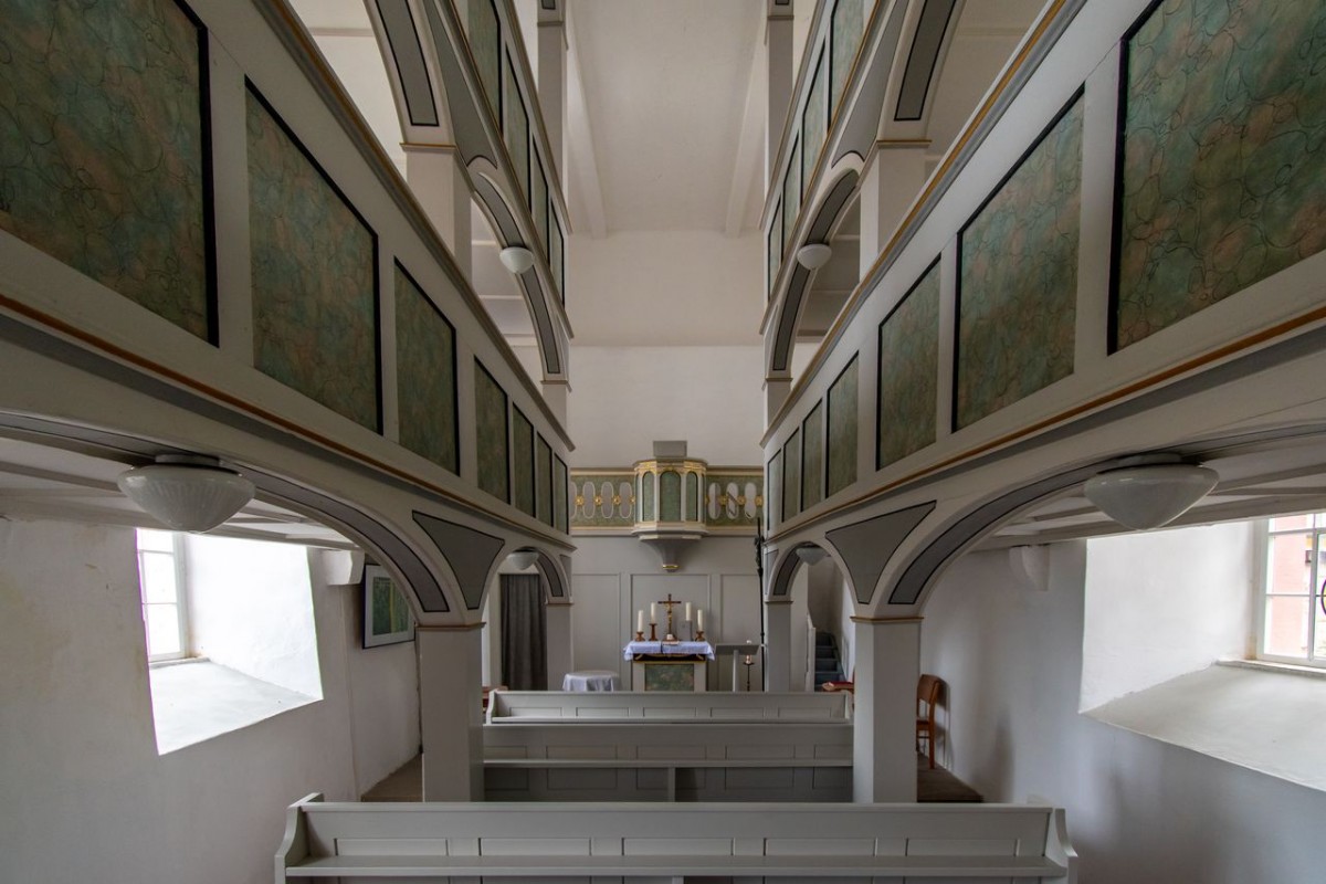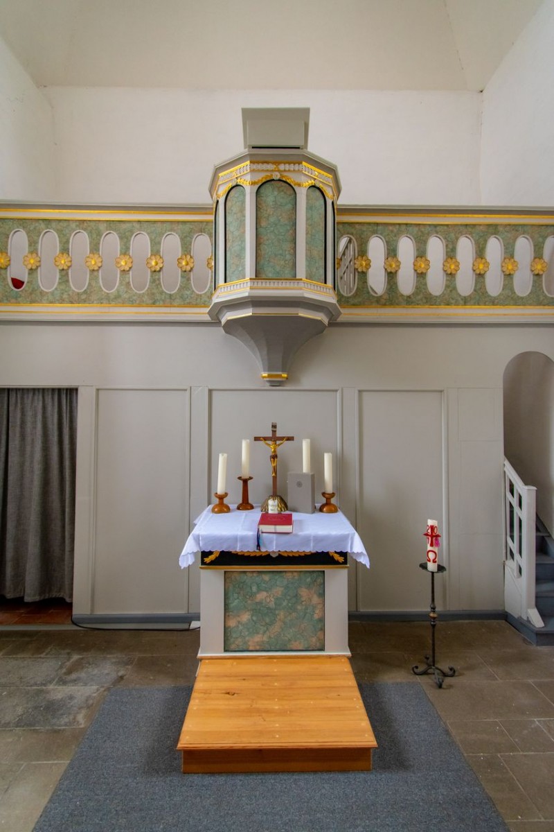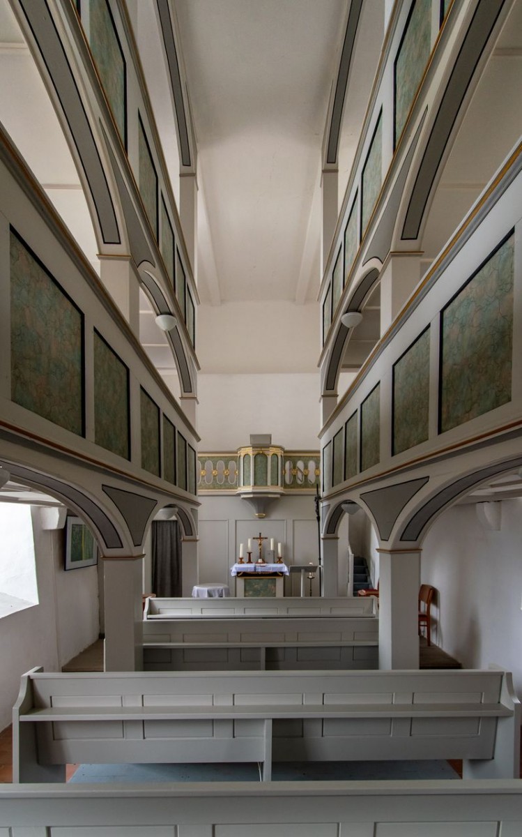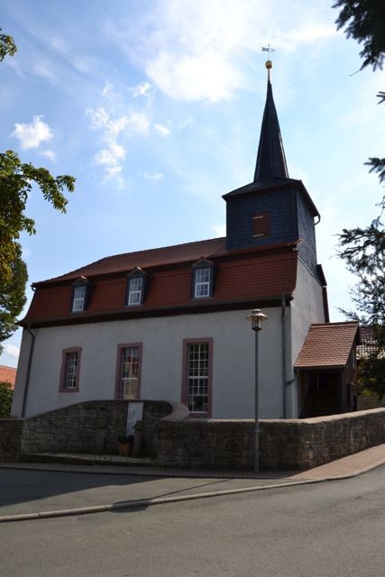 Die sehr kleine, schlichte Kirche wurde im Jahr 1381 erstmals urkundlich erwähnt. Nach einem verheerenden Brand im Oktober 1802, wobei die Kirche und 28 Wohnhäuser zerstört wurden, machte man sich an den Neubau auch der Kirche in ihrer heutigen Gestalt mit Mansardendach und spitzem Turm als Dachreiter über dem Westeingang auf den Grundmauern der alten Kirche. 1806 konnte die Kirche eingeweiht werden. Die Orgel wurde im Jahr 1832 aus Thangelstedt gekauft. 1834 besuchte die Großherzogin Maria Pawlowna das kleine Bergdorf und veranlasste die Unterstützung der Gemeinde bei der Erneuerung des Kirchendaches und der Friedhofsmauer. Die kleine örtliche Gemeinde hat seit Mitte des 20. Jahrhunderts die Kirche kontinuierlich gepflegt und erneuert, so dass sie sich heute in einem tadellosem Zustand befindet. Eine elektrische Heizung der Bänke, wunderschöne Bleiverglasungen in den Fenstern und eine angenehme farbliche Fassung des Innenraumes verstärken diesen Eindruck.