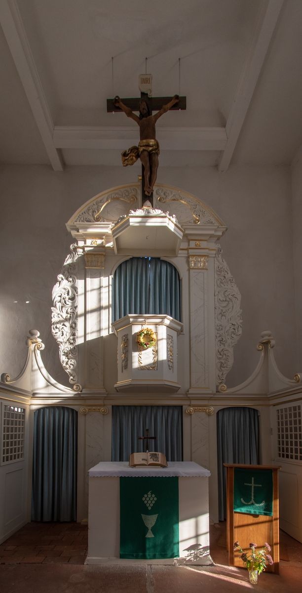 Das überlebensgroße Kruzifix auf dem Kanzelaltar stellt den ältesten Einrichtungsgegenstand der Kirche dar. Es stammt aus dem 16. Jahrhundert und ist damit älter als die Kirche selbst