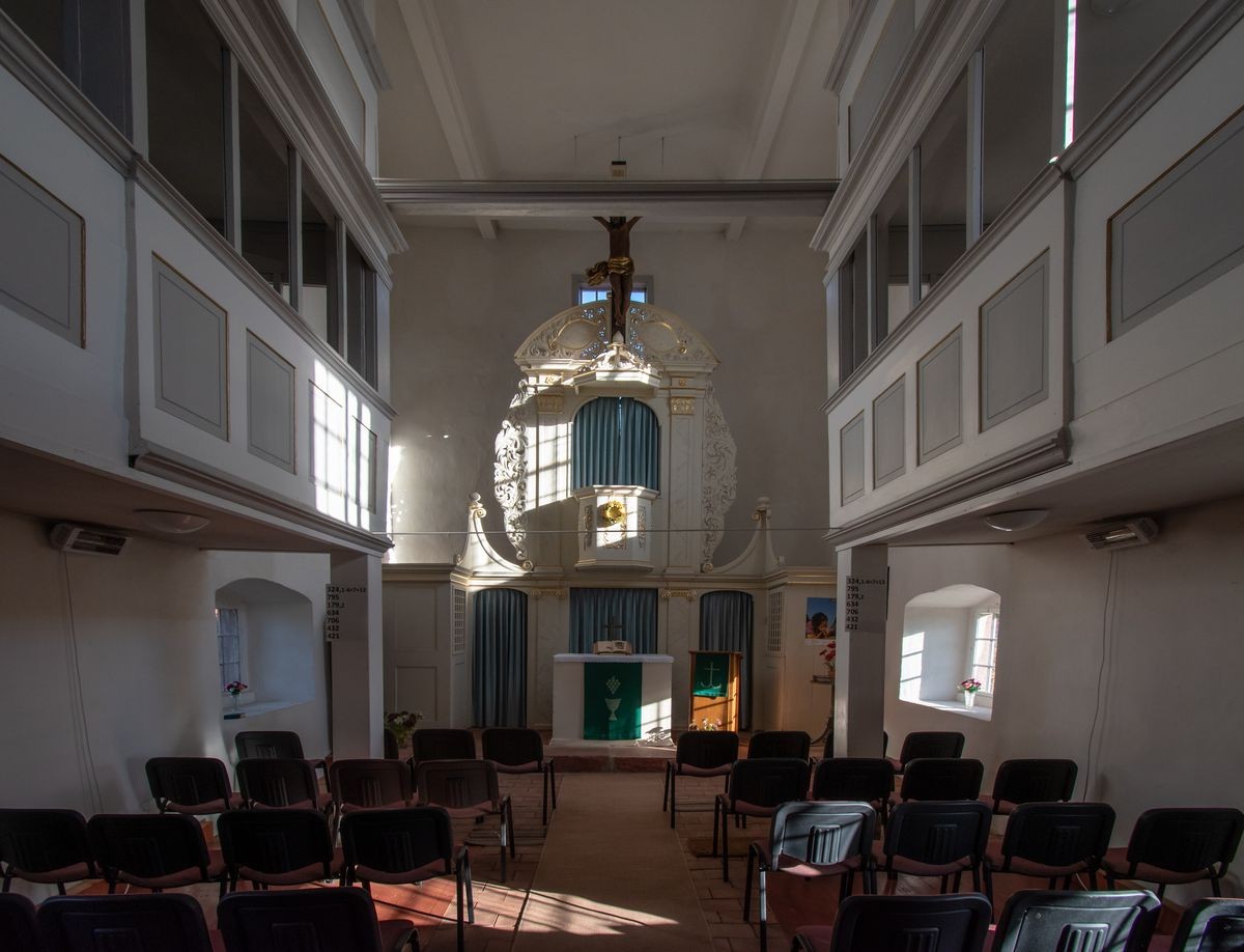 Der Innenraum der Kirche ist in einem schlichten Barockstil gehalten. Wertvoll ist er vor allem, weil er weitgehend unverändert blieb. Der Kanzelaltar stammt aus dem 18. Jahrhundert.