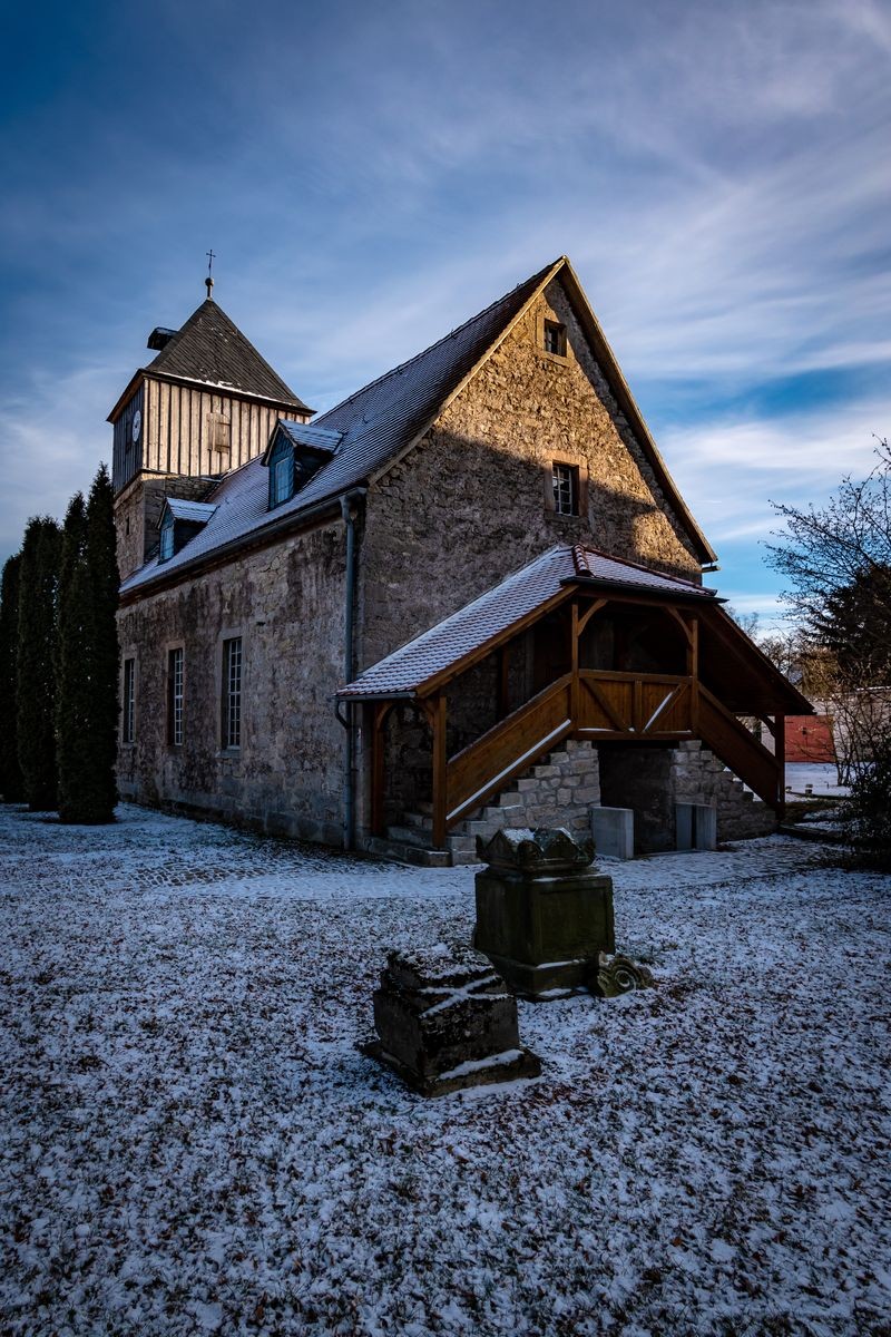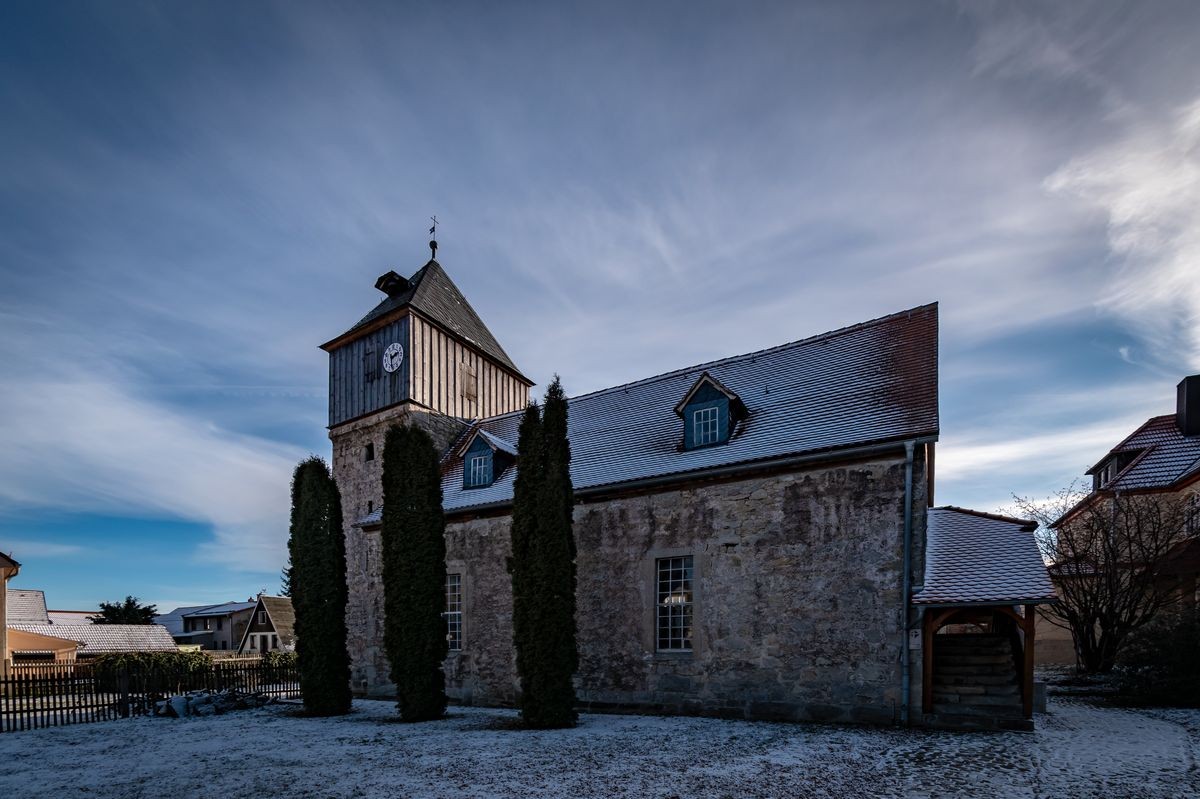 ursprünglich romanische Chorturmkirche aus dem 13. Jahrhundert (Reste von Rundbögen an Türen und Fenstern, steinerner Altartisch)