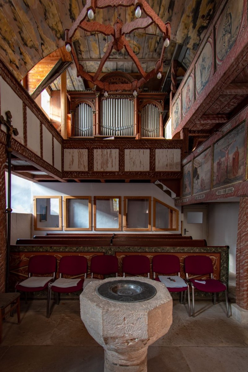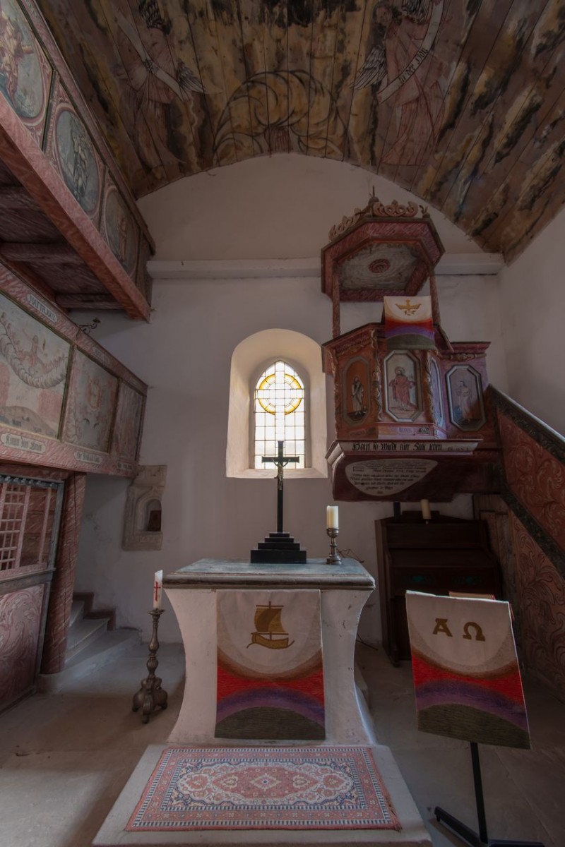 an der Decke die Dreifaltigkeit, an der Kanzel Jesus und die Evangelisten