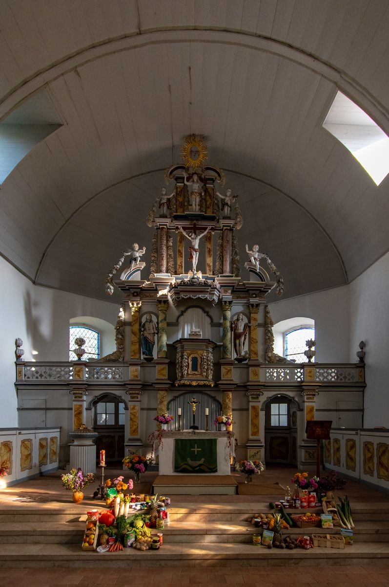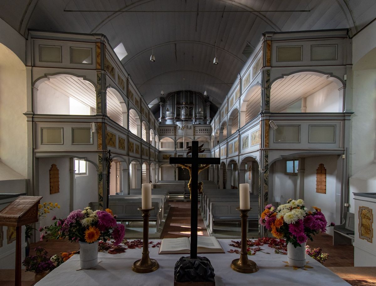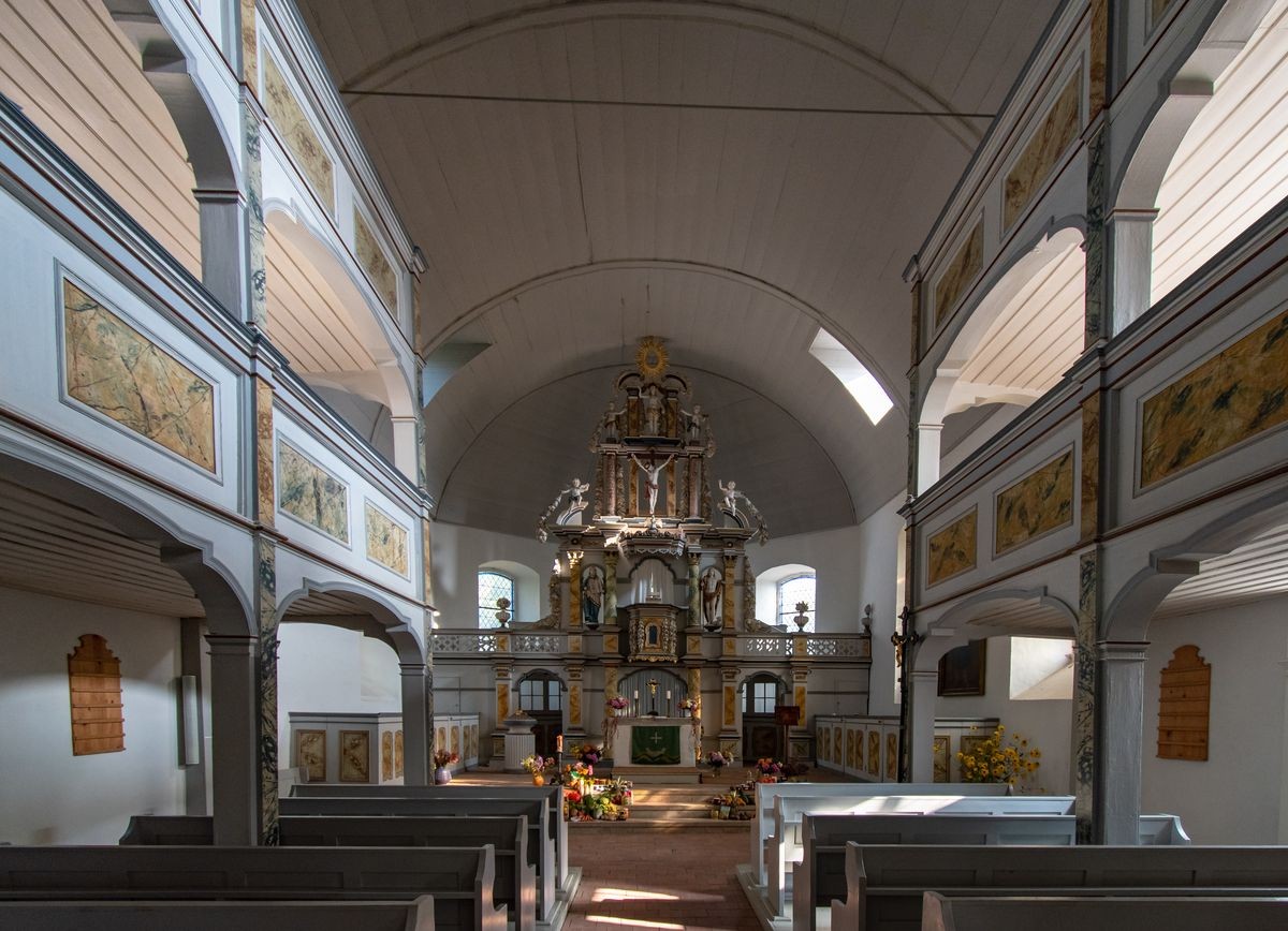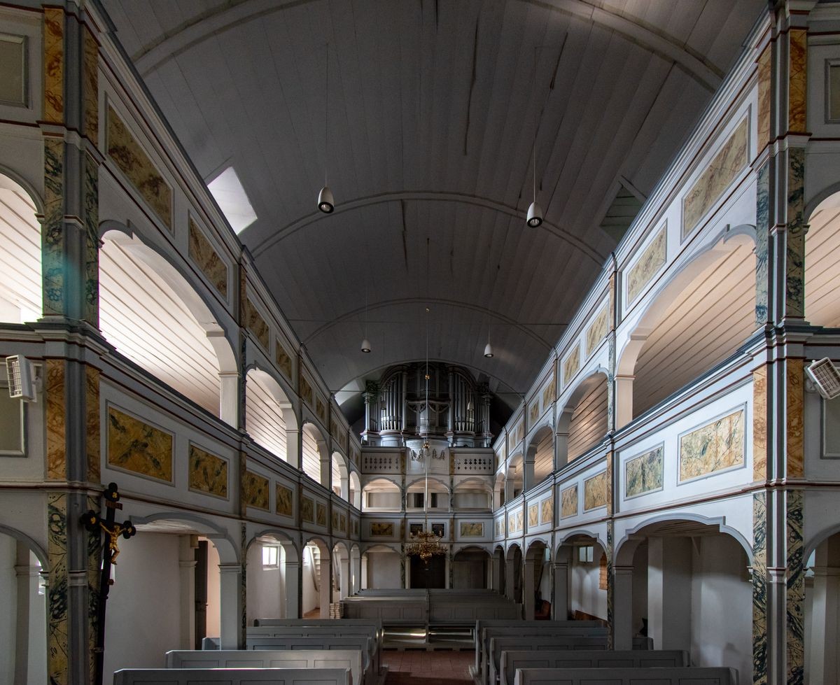 1724 - 1730 wurde das Kirchenschiff neu gestaltet. Es erhielt einen dreiseitigen Chorabschluß, 13 große Fenster sowie 6 Dachfenster, eine Holztonne, doppelte Emporen und einen prächtigen Kanzelaltar in vier Geschossen mit reicher Barockarchitektur, der unten die ganze Breite des Altarraumes einnimmt. Die Dacheindeckung erfolgte mit Schiefer.