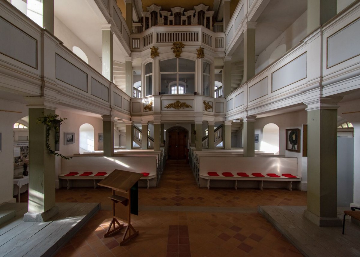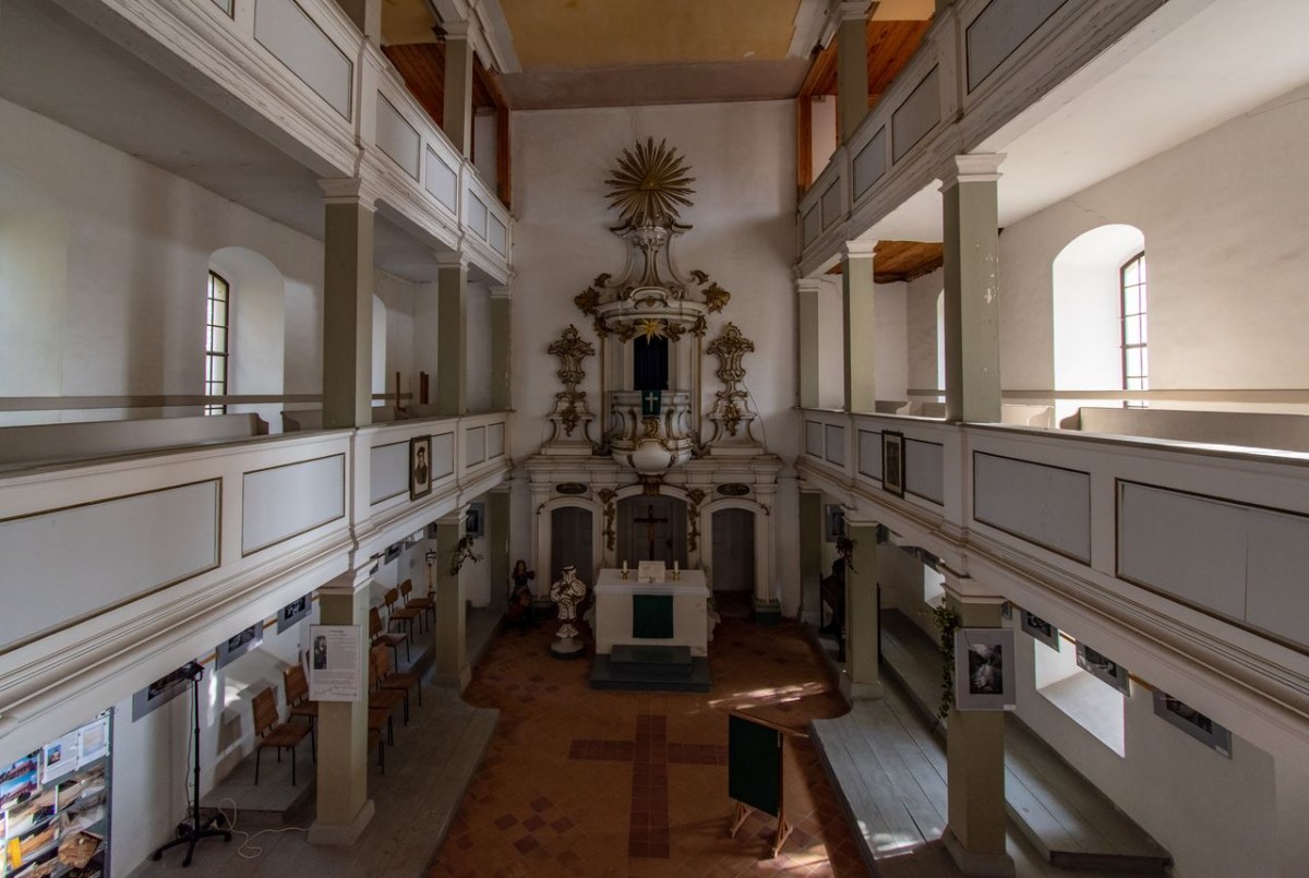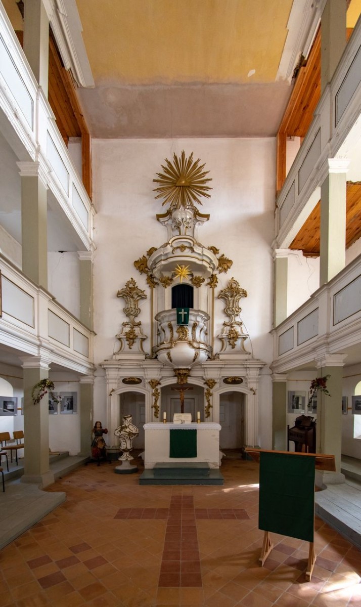 Die Kirche wurde Anfang des 18. Jhds. gebaut und ist sehr geräumig mit einem großem Chorraum. Sie ist weiß geputzt bzw. gestrichen und mit vergoldeten Rokoko-Ornamenten verziert. Der Kanzelbau (um 1735) und das Taufgestell (um 1740) stammen auch aus der Zeit des Rokoko.